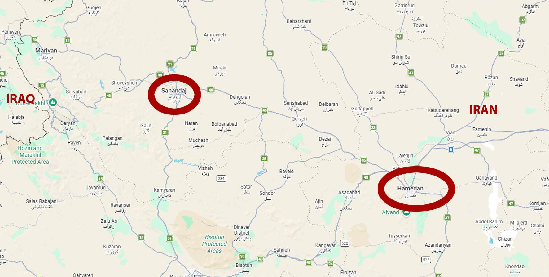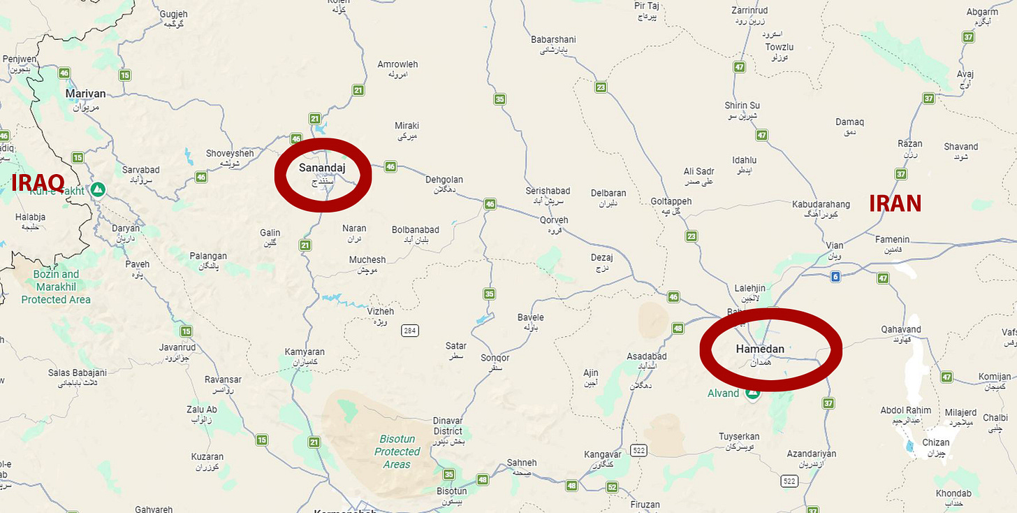 2.) As obvious for anybody with any trace of clue about Iran’s geography, Sanandaj is a town in the Kurdistan Province in western Iran, on the border to Iraq, some 180km away from Hamedan, a city in the Hamedan Province of Iran.