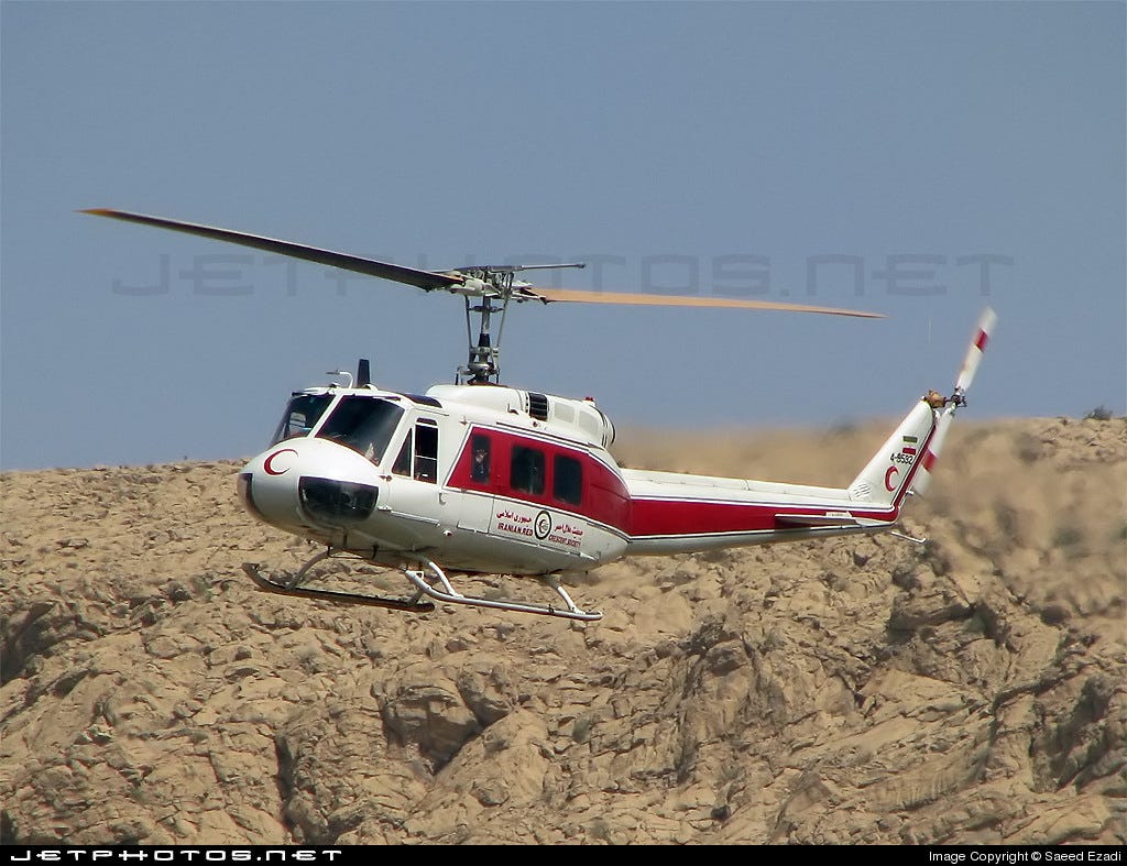 1.) As obvious from the video, the ‘Mi-17’ helicopter was a Bell 214A Isfahan. The example in question was operated by the Islamic Republic of Iran Red Crescent (IRIRC), i.e. was used for emergency evacuations: