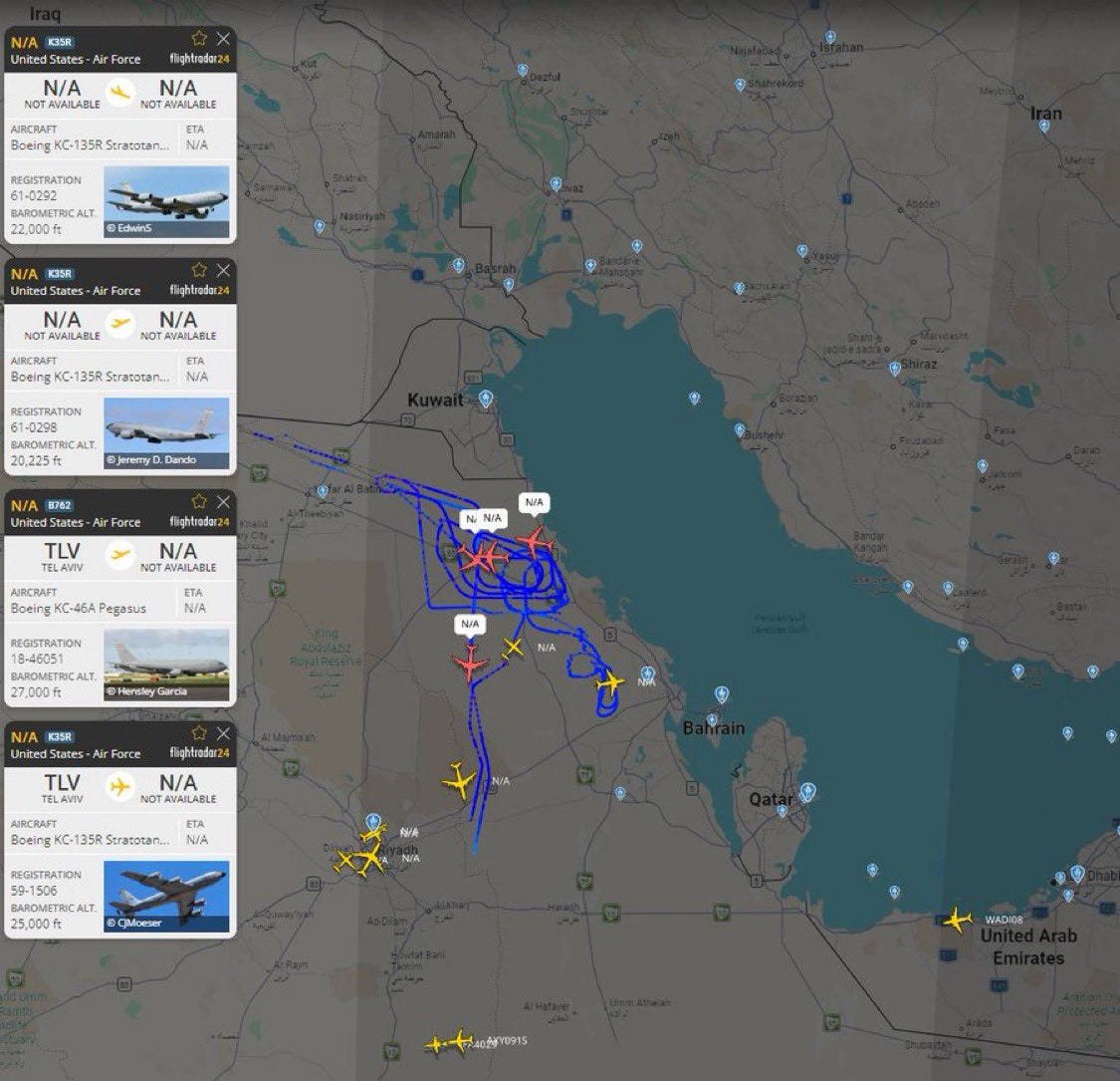 Even better: the Israelis reported this as a joint US-Israeli strike, or at least as a strike undertaken in coordination and/or with approval with the USA. Indeed, gauging by such things like could be monitored with help of the Flightradar24 - like this group of USAF KC-46 and KC-135 tankers over north-eastern Kingdom of Saudi Arabia, around the time the strike was flown: