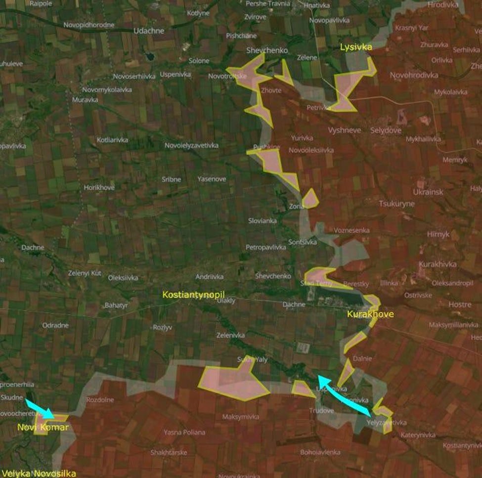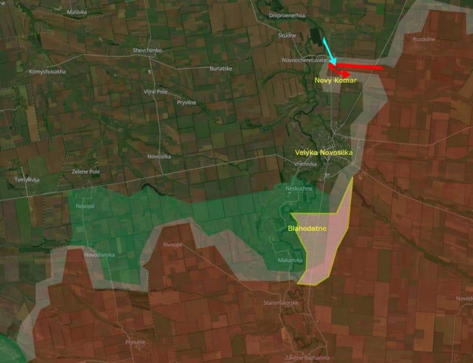 The Russians occupied Novy Komar, cutting off Velyka Novosilka from the northern roads. Three days later, the 48th Separate Assault Battalion attacked and reclaimed the village and the surviving Russian infantry retreated.