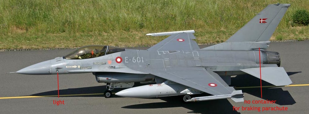 no container for braking parachute on the base of the fin (not all the F-16A/AMs have this container installed).