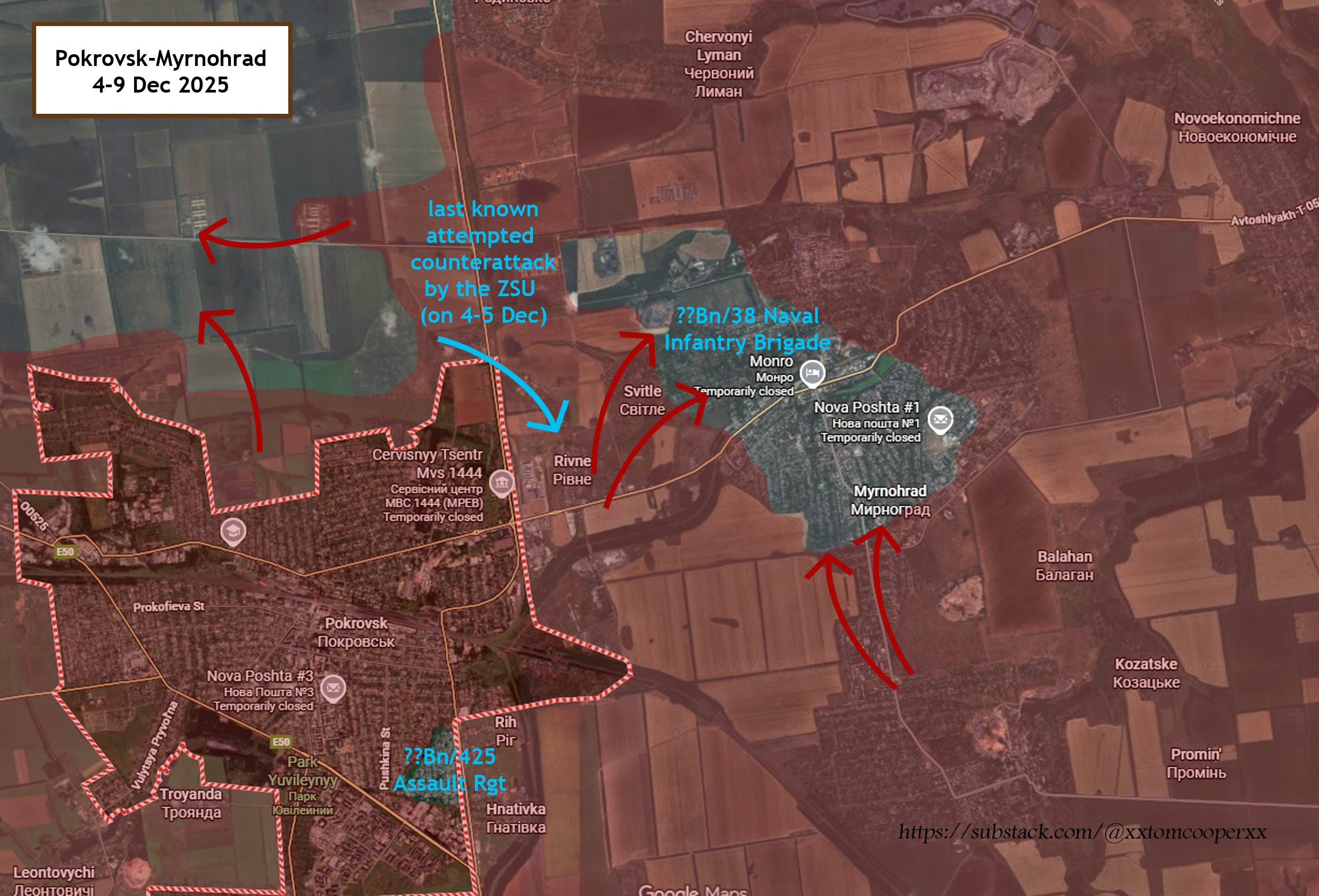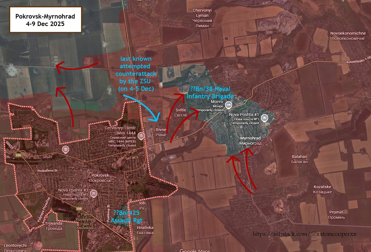 Actually, in the Pokrovsk sector, the Russian advances from north of that town and from north of Myrnohrad have created a solid encirclement around the battalion of the 38th Naval Infantry Brigade still holding out inside Myrhnohrad. The ZSU’s efforts to punch through and lift the siege have all failed: that unit now definitely can’t get out. Where the ZSU-held pocket in Myrnohrad is constantly decreasing, too: the Russians have captured the Zapadny District, reached the Stusa Street and are infiltrating high-rise buildings in the 40th District.